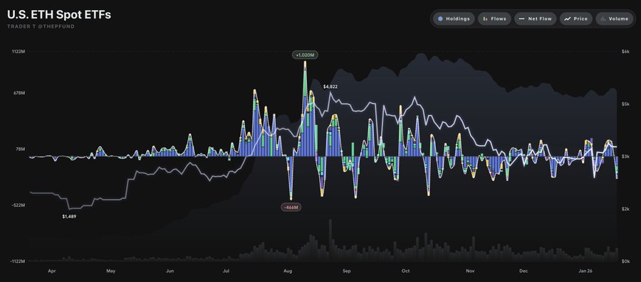 1월 21일 트레이더T에 따르면, 현지 시간으로 20일 미국 이더리움 현물 ETF 시장에 총 2억3855만 달러(약 3531억원)가 순유출로 집계됐다.