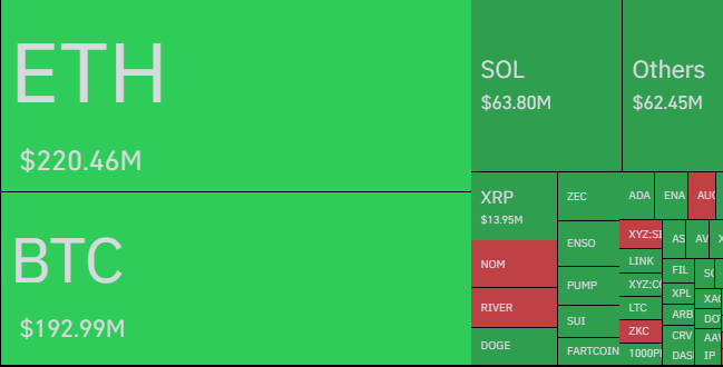 단일 건 기준 최대 청산은 바이낸스에서 발생한 ETH/USDT로, 1522만달러(약 219억원)였다.