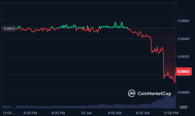 29일 팔콘 파이낸스 산하 달러 연동 스테이블코인 USDf가 1달러 기준가에서 소폭 이탈해 최저 0.9871달러까지 내려갔고, 현재는 0.99달러 수준에서 거래되고 있다.
