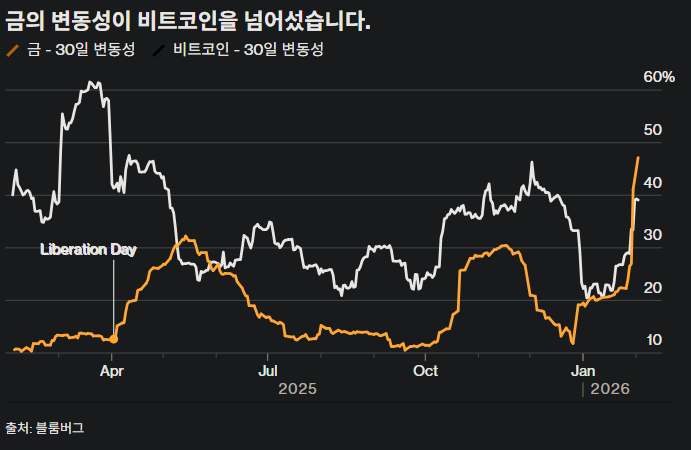금의 변동성이 비트코인을 넘어섰다. 금값이 최근 급등세 이후 낙폭이 커지며 지난 20여 년 중 가장 거친 구간에 들어섰다는 평가다.