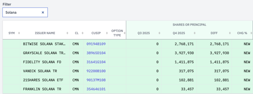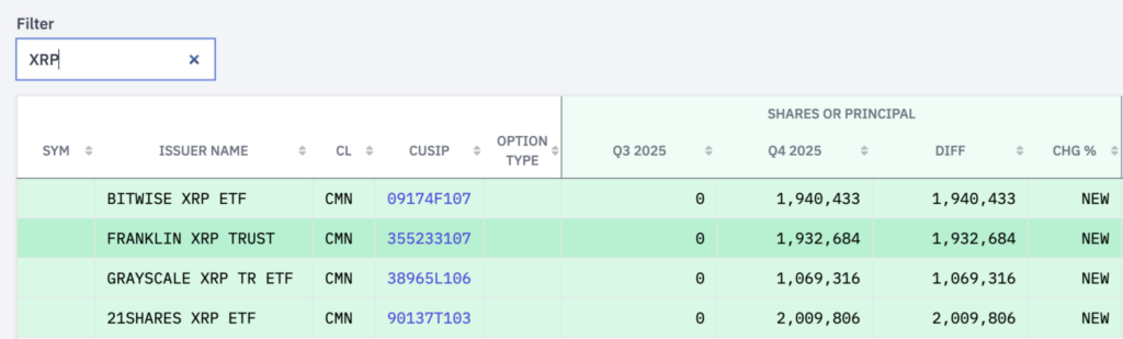 가상자산 업계가 주목하는 대목은 XRP와 SOL의 신규 편입이다. SEC 신고 데이터를 보면 골드만삭스는 비트와이즈, 프랭클린 템플턴 등이 운용하는 XRP 현물 ETF 4종과 비트와이즈, 그레이스케일, 피델리티 등이 발행한 SOL 현물 ETF 6종을 보유 중인 것으로 나타났다. 2025년 3분기 당시 해당 자산의 보유 수량은 없었으나 XRP 현물 ETF가 미국 시장에서 거래를 시작한 12월 초를 기점으로 첫 분기 보고서에 반영됐다.