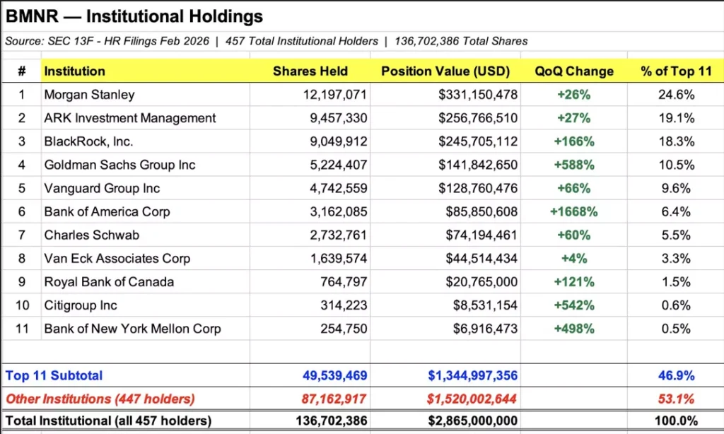 이외에도 블랙록은 전 분기대비 166%, 골드만삭스 588%, 뱅크오브아메리카 1668%, 뱅가드는 66% 각각 비트마인 지분을 늘렸다. 찰스슈왑, 반에크, 캐나다 로얄뱅크, 시티그룹, 뉴욕멜론은행을 포함한 상위 11개 주주 모두 지난 2025년 4분기 동안 비트마인 노출도를 확대한 것으로 집계됐다.