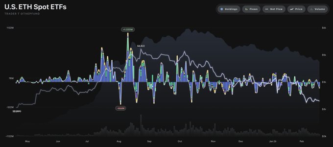 2월 20일 트레이더T에 따르면, 현지 시간으로 19일 미국 이더리움 현물 ETF 시장에 총 1억3051만 달러(약 1892억원)가 순유출로 집계됐다.