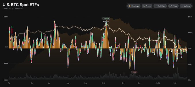 2월 24일 트레이더T에 따르면, 현지 시간으로 23일 미국 비트코인 현물 ETF 시장에 총 2억582만 달러(약 2984억원)가 순유출로 집계됐다.