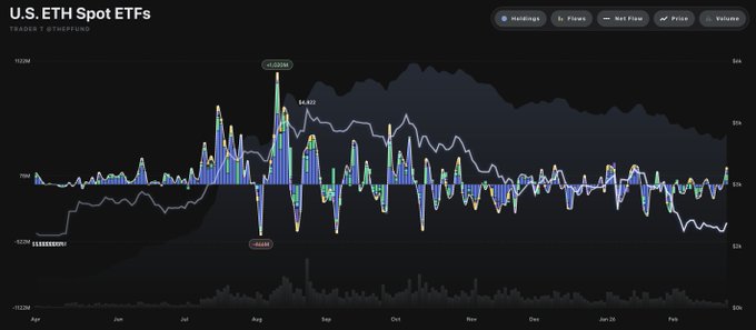 2월 26일 트레이더T에 따르면, 현지 시간으로 25일 미국 이더리움 현물 ETF 시장에 총 1억5708만 달러(약 2278억원)가 순유입으로 집계됐다.