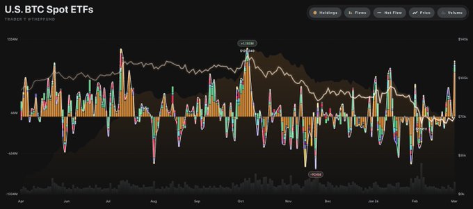3월 3일 트레이더T에 따르면, 현지 시간으로 2일 미국 비트코인 현물 ETF 시장에 총 9억6248만 달러(약 1조4090억원)가 순유입으로 집계됐다. 지난해 10월 이후 가장 큰 일간 순유입을 기록했다.