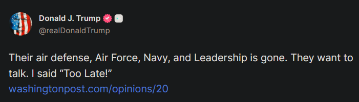 이어 이란이 협상을 원하고 있다면서도 “너무 늦었다”고 적었다.