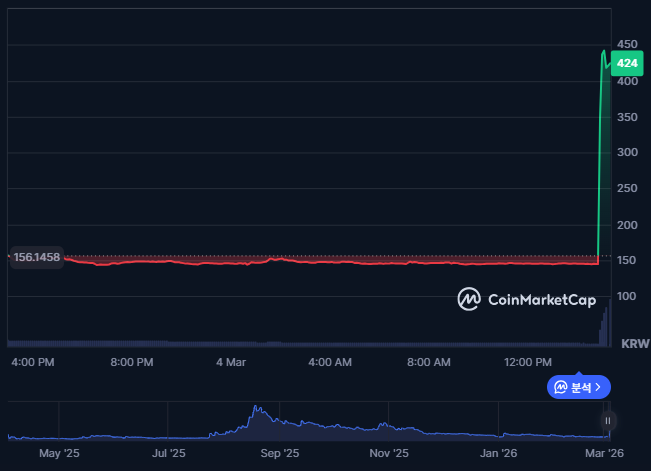 4일 코인마켓캡 데이터에 따르면 EDGE는 업비트와 빗썸 상장 소식이 전해진 직후 급등해 한때 208% 뛰었으며, 현재 코인베이스 기준 약 170% 상승한 0.270달러(약 420원)선에서 거래되고 있다.