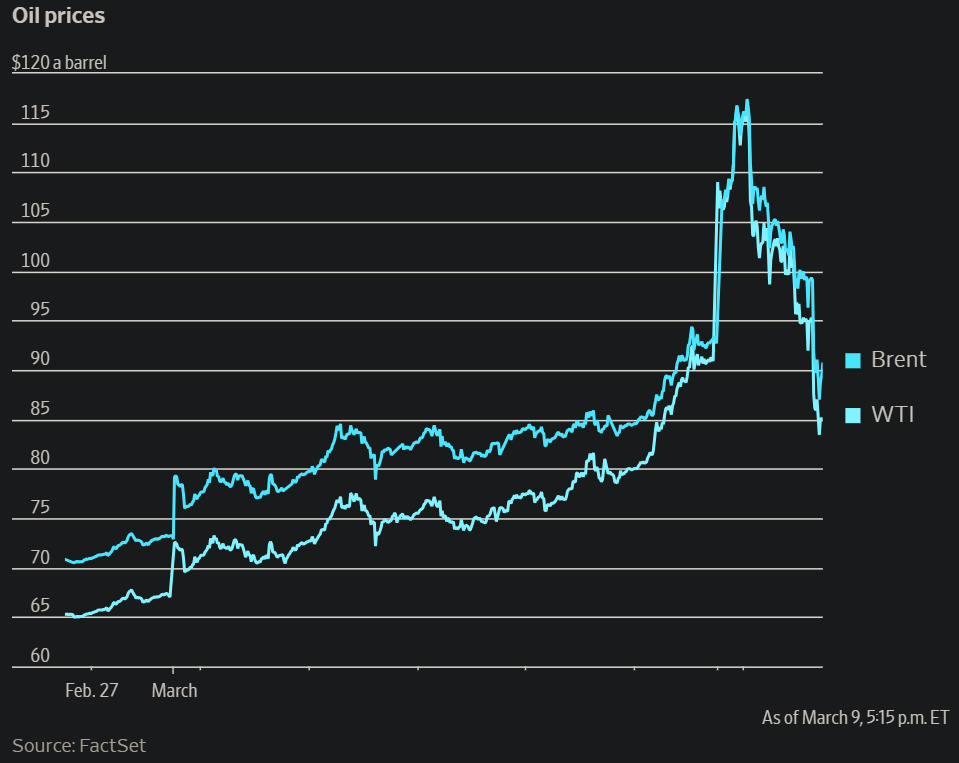 글로벌 기준유 브렌트유는 배럴당 90달러 아래로 떨어져 89.45달러로 내려갔다. 미국 서부텍사스산원유(WTI)는 배럴당 85.05달러 수준으로 내려갔다. 앞서 브렌트유는 장중 2022년 중반 이후 최고 수준까지 상승했고, WTI는 한때 배럴당 119달러를 웃돌았다.