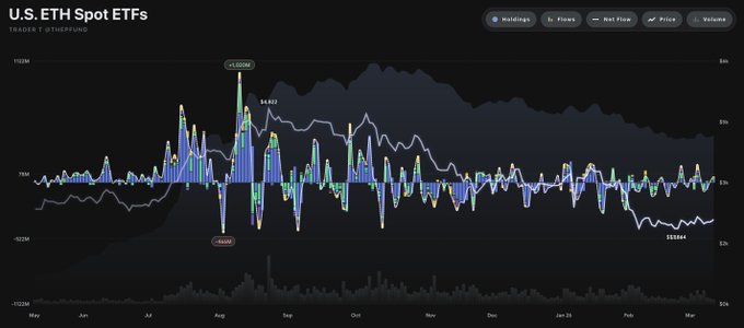 3월 12일 트레이더T에 따르면, 현지 시간으로 11일 미국 이더리움 현물 ETF 시장에 총 5711만 달러(약 828억원)가 순유입으로 집계됐다.