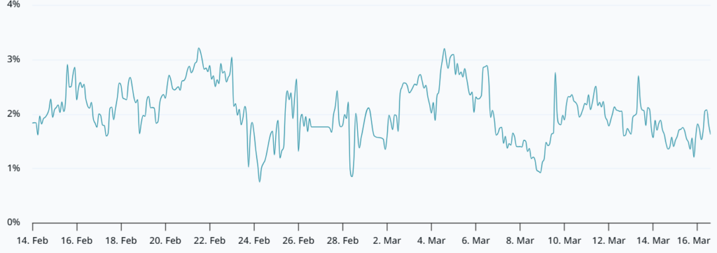 파생상품 지표는 여전히 약세 성향을 가리켰다. 현물 대비 비트코인 2개월 선물 프리미엄은 연율 기준 약 2%로, 통상적인 중립 구간인 4~8%보다 낮았다.