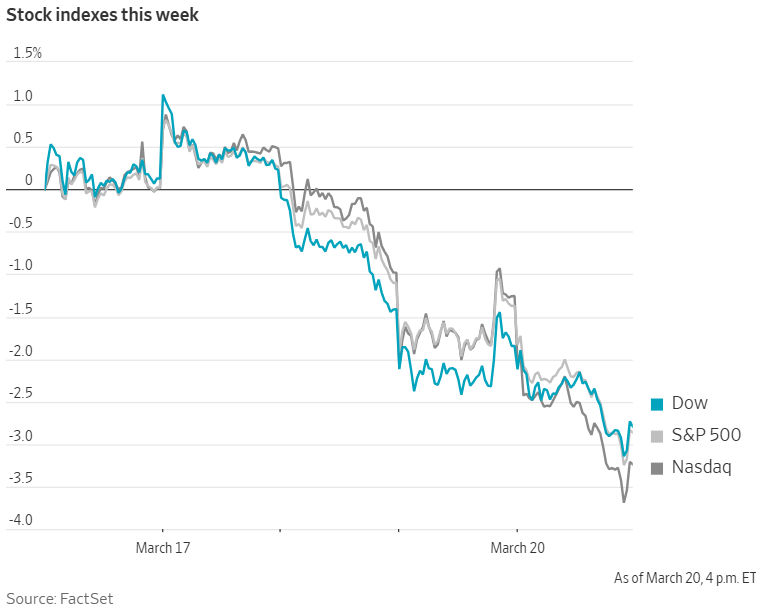 3월 20일(현지시간) 뉴욕 증시에서 다우존스산업평균지수는 0.96% 내렸고, S&P 500지수는 1.51% 하락했다. 나스닥종합지수는 2.01% 떨어지며 낙폭이 가장 컸다. 나스닥은 최고점 대비 9.6% 낮은 수준에 머물렀다.