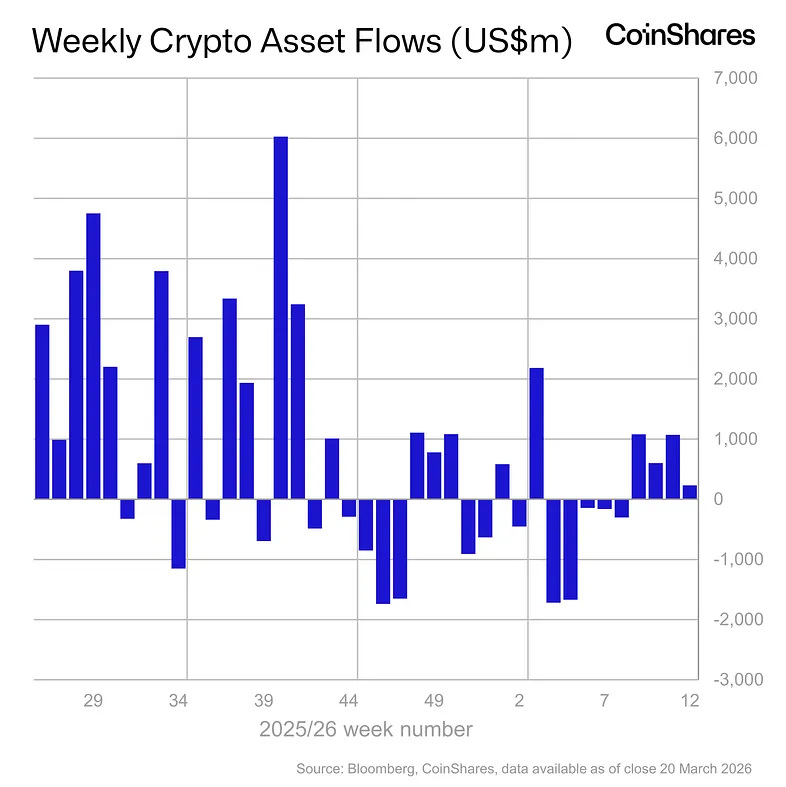 23일 코인쉐어스 디지털자산 주간 보고서에 따르면, 지난주 디지털 자산 투자 상품에 2억3000만달러(약 3450억원)가 들어왔다. 이전 주 대비 증가 폭이 줄었다.