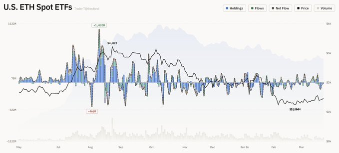 3월 24일 트레이더T에 따르면, 현지 시간으로 23일 미국 이더리움 현물 ETF 시장에 총 1642만 달러(약 246억원)가 순유출로 집계됐다.