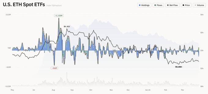 3월 27일 트레이더T에 따르면, 현지 시간으로 26일 미국 이더리움 현물 ETF 시장에 총 9297만 달러(약 1395억원)가 순유출로 집계됐다.