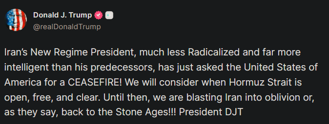 도널드 트럼프 미국 대통령은 4월 1일 트루스소셜을 통해 이란 대통령이 휴전을 요청했다고 주장했다. 이란의 새 정권이 기존 지도부보다 급진성이 낮고 지능적이라고 평가하며, 해당 요청이 있었다고 언급했다.