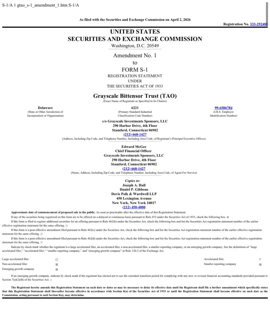 4월 2일(현지시간) 미국 증권거래위원회(SEC)에 제출된 문서에 따르면, 디지털자산운용사 그레이스케일이 가상자산 비트텐서(TAO) 트러스트(신탁)을 상장하기 위해 등록신고서(Form S-1) 수정안을 제출했다.