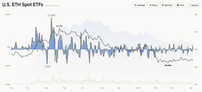 4월 7일 트레이더T에 따르면, 현지 시간으로 6일 미국 이더리움 현물 ETF 시장에 총 1억2024만 달러(약 1804억원)가 순유입으로 집계됐다.