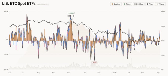 4월 7일 트레이더T에 따르면, 현지 시간으로 6일 미국 비트코인 현물 ETF 시장에 총 4억7131만 달러(약 7070억원)가 순유입으로 집계됐다.