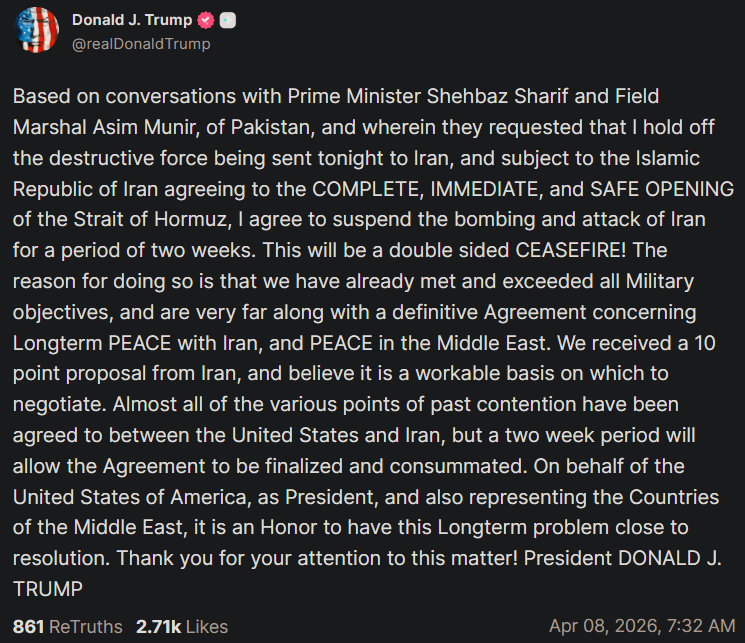 도널드 트럼프 미국 대통령은 8일 트루스소셜에 파키스탄 셰바즈 샤리프 총리, 아심 무니르 원수와의 대화를 언급하며, 이들이 이란을 향해 예정된 군사 행동을 보류해 달라고 요청했다고 올렸다. 이에 따라 이란이 호르무즈 해협을 완전하고 즉각적으로, 개방하는 데 동의하는 조건 아래 이란에 대한 폭격과 공격을 2주간 중단하는 데 동의했다고 밝혔다.