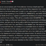 이어 이란으로부터 10개 항목의 제안을 받았으며 이를 협상의 기반으로 활용할 수 있다고 말했다. 미국과 이란 사이 주요 쟁점 대부분에 대해 의견 접근이 이뤄졌고, 2주 동안 최종 합의를 마무리할 수 있을 것으로 본다고 설명했다.