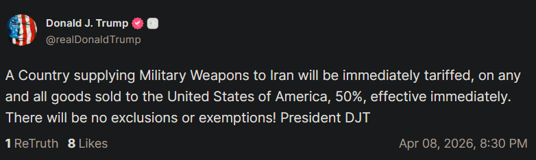 도널드 트럼프 미국 대통령은 8일 트루스소셜을 통해 이란에 군사 무기를 공급하는 국가는 미국에 수출하는 모든 상품에 대해 50% 관세를 즉시 적용할 것이라며 예외나 면제가 없다고 했다.