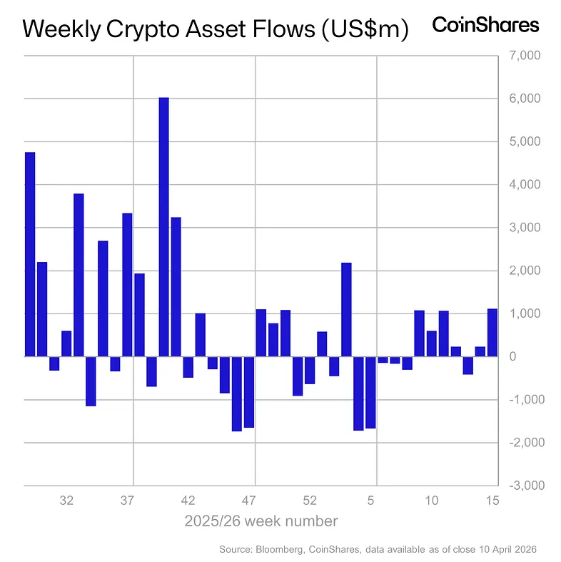 디지털자산 운용사 코인쉐어스는 13일(현지시간) 보고서를 통해 지난 주 디지털 자산 투자상품에 11억달러(약 1조6280억원)가 순유입됐다고 전했다. 1월 이후 주간 기준 최대 유입 규모다. 코인쉐어스는 미국 소비자물가지수(CPI)가 예상보다 낮게 나오고, 이란을 둘러싼 긴장 완화가 반영된 결과로 풀이했다.
