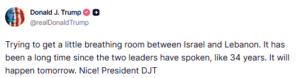 또한 이스라엘과 레바논은 미 동부시간 기준 16일 오후 5시(한국시간 기준 17일 오전 6시)부터 10일간 휴전에 들어갔다. 트럼프 대통령은 조제프 아운 레바논 대통령과 베냐민 네타냐후 이스라엘 총리를 백악관으로 초청해 평화 논의를 진행하겠다고 말했다.