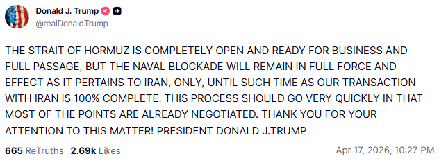 도널드 트럼프 미국 대통령은 17일(현지시간) 트루스소셜을 통해 호르무즈 해협이 전면 개방돼 통항이 가능하다고 밝혔다. 다만 이란에 대해서는 해상 봉쇄를 계속 유지한다고 설명했다.