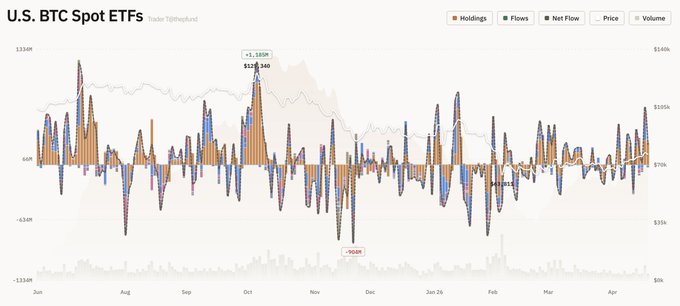4월 21일 트레이더T에 따르면, 현지 시간으로 20일 미국 비트코인 현물 ETF 시장에 총 2억3837만 달러(약 3570억원)가 순유입으로 집계됐다.