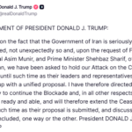 트럼프 대통령은 트루스소셜에 이란 정부가 심각하게 분열돼 있다며, 파키스탄의 아심 무니르(Asim Munir) 육군원수와 셰바즈 샤리프(Shehbaz Sharif) 총리의 요청에 따라 이란 공격을 보류해 달라는 요청을 받았다고 밝혔다.
