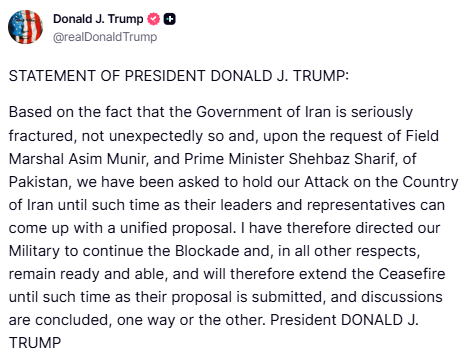 트럼프 대통령은 이란 지도부와 대표들이 단일한 제안을 마련할 때까지 공격을 보류하기로 했다고 적었다. 그러면서 미군에는 봉쇄를 계속하고, 다른 모든 면에서는 즉시 대응할 수 있도록 대비 태세를 유지하라고 지시했다고 밝혔다.