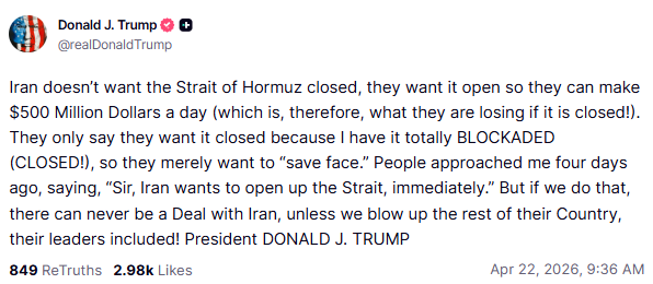 도널드 트럼프 미국 대통령이 22일 트루스소셜에 올린 글에서 이란은 호르무즈 해협 봉쇄를 원하지 않으며, 해협이 열려 있어야 하루 5억달러(약 7350억원)를 벌 수 있다고 주장했다. 트럼프 대통령은 해협이 닫히면 이란이 그만큼 잃게 된다며, 이란이 해협 폐쇄를 말하는 것은 자신이 해협을 완전히 봉쇄했기 때문에 체면을 지키려는 것이라고 썼다.