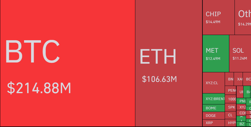 같은 기간 코인별 청산 규모는 비트코인 숏 포지션에서 2억1488만달러(약 3158억원), 이더리움 숏 포지션에서 1억663만달러(약 1567억원), 유에스디에이아이(CHIP) 1449만달러(약 212억원) 규모 청산이 발생했으며 메테오라(MET) 롱 포지션에서 1249만달러(약 183억원) 청산이 발생했다.