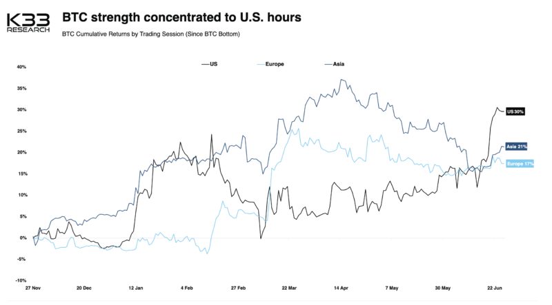 암호화폐 분석 업체 K33 리서치는 최근 비트코인의 가격 상승과 거래량이 미국 시장 시간에 집중되고 있으며, 이러한 흐름이 비트코인의 강세를 뒷받침하는 주요 요인이라고 지적했다.