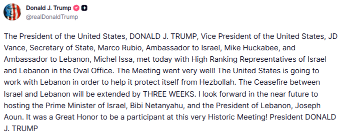 한편 도널드 트럼프 미국 대통령은 트루스소셜을 통해 이스라엘과 레바논 간 휴전을 3주 연장한다고 밝혔다. 또 가까운 시일 내 베냐민 네타냐후 이스라엘 총리와 조제프 아운 레바논 대통령을 초청하길 기대한다고 말했다.