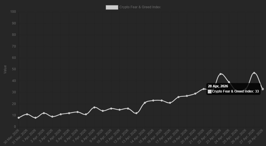 지난 한달 간 시장 심리는 개선되는 흐름이다. 데이터 제공업체 얼터너티브(Alternative) 데이터에 따르면, 한달전 암호화폐 공포·탐욕 지수는 8로 극심한 공포에서 4월 28일 기준 33으로 공포 구간에 위치했다.