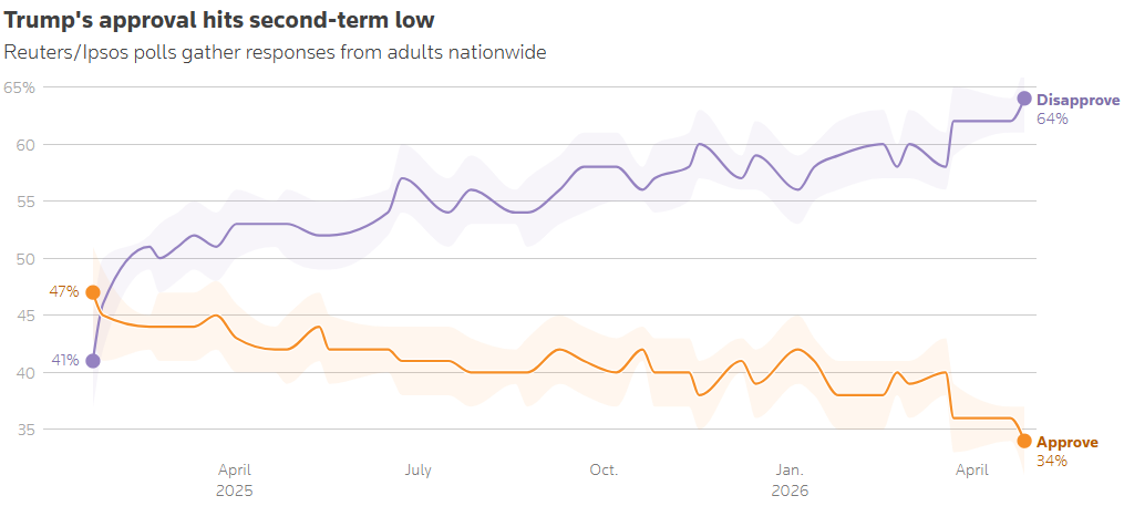 로이터 통신과 입소스가 실시한 여론조사에서 도널드 트럼프 미국 대통령 국정 지지율이 34%로 집계됐다. 이전 조사(36%)보다 하락하며 현 임기 최저치를 기록했다. 조사 응답자들은 이란과의 군사 충돌과 생활비 부담 대응에 대해 낮게 평가했다.