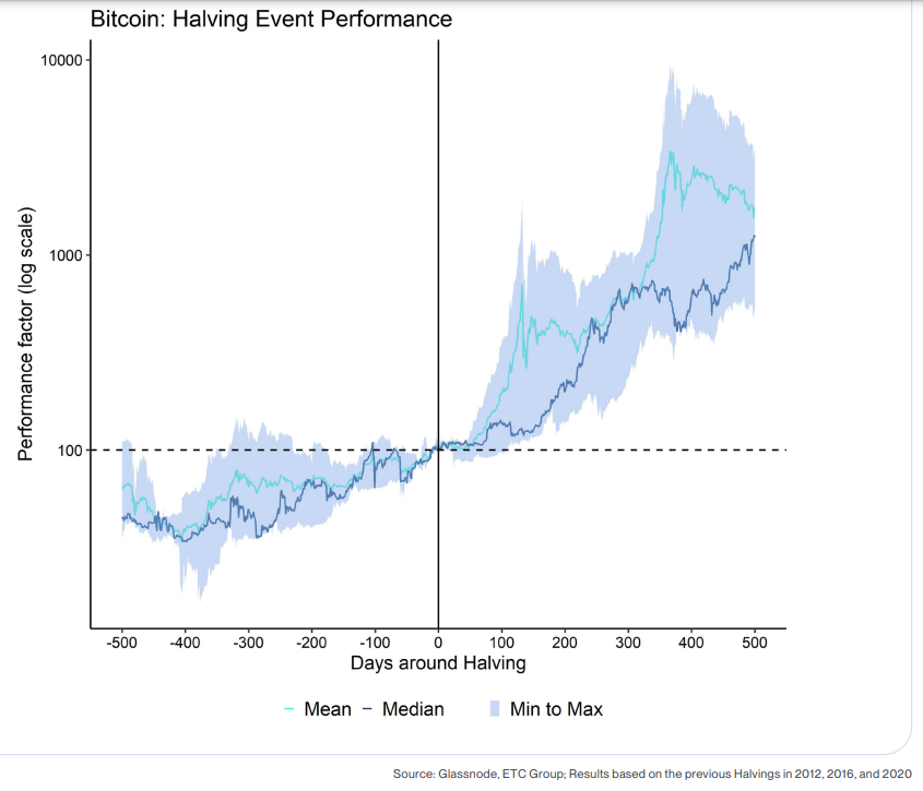 이번 상승은 반감기 후 100일간 일정한 가격대를 유지하다 상승하는 과거 패턴과 유사해 시장의 관심을 끌고 있다. ETC그룹 조사에 따르면 지난 3번의 반감기 이후 500일 동안 비트코인 시세는 평균 17배 상승했다.