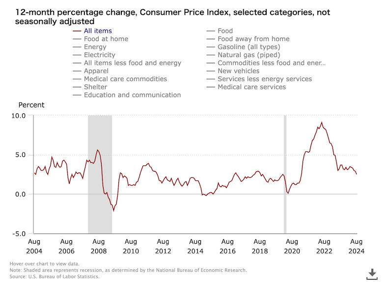 미국 노동부가 11일 발표한 8월 소비자물가지수(CPI)는 전년 대비 2.5% 상승하며 21년 2월 이후 가장 낮은 상승률을 기록했다.