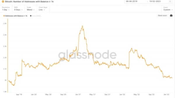 1,000개 이상의 비트코인을 보유한 네트워크의 고래 수는 2019년 8월 이후 최저 수준으로 떨어졌다. 가상화폐 분석 회사 Glassnode의 데이터에 따르면 2월 19일 2,027개의 고래 주소가 있었으며, 주력 암호화폐의 가격이 50,000달러(약 7,250만 원)에 가까웠던 2021년 2월 약 2,500개의 고래 지갑에서 감소했다.