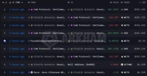 이더리움 공동 창업자 비탈릭 부테린이 5일, CATE 프로젝트에서 기부받은 10만 USDT를 포함하여 네이로(NEIRO) 7,071만 개, 무뎅 (MOODENG) 117억 6천만 개, 디젠(DEGEN) 780만 개, 카보스(KABOSU) 16억 3천만 개를 탈중앙화 거래소 카이버스왑(KyberSwap)에서 매각했다.