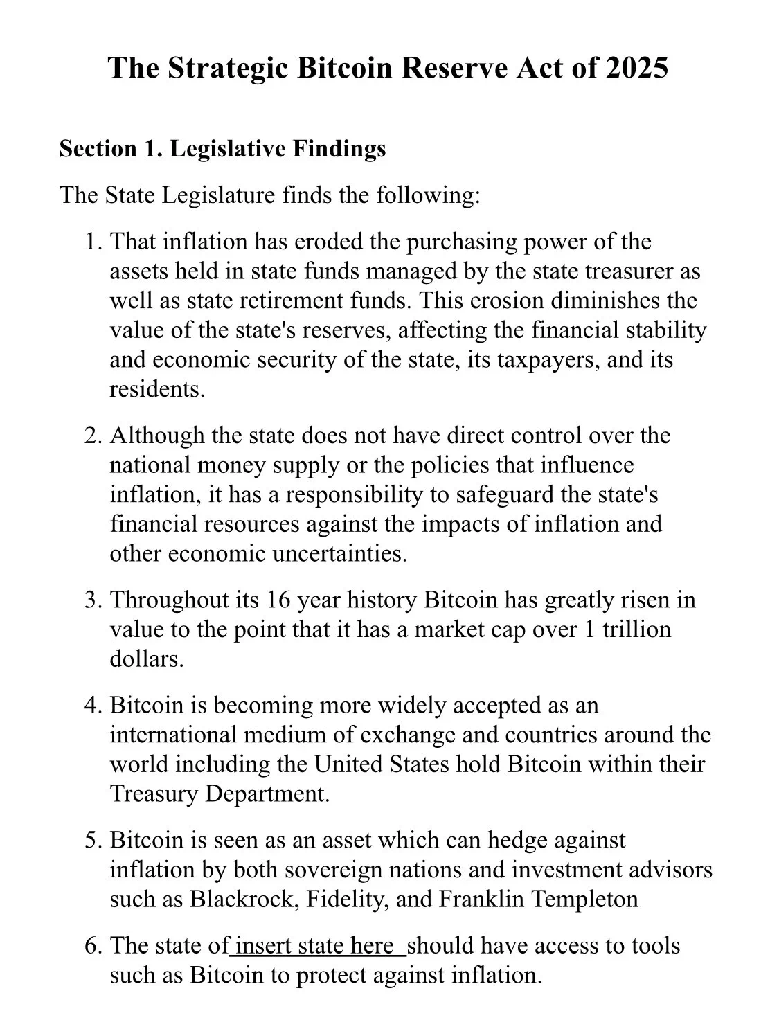 사토시 액션 펀드의 CEO인 데니스 포터는 X(구 트위터)를 통해 해당 법안 초안을 공개하며, 다른 주들이 유사한 정책을 채택할 수 있도록 구체적인 입법 모델을 오픈소스 형태로 제공한다고 밝혔다.