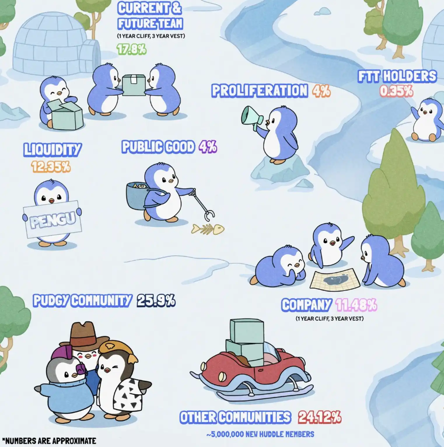 NFT 프로젝트 퍼지 펭귄이 자체 토큰 PENGU를 출시한다고 6일 밝혔다. 총 888억 8,888만 8,888개의 PENGU 토큰이 솔라나 블록체인에서 발행될 예정이다.