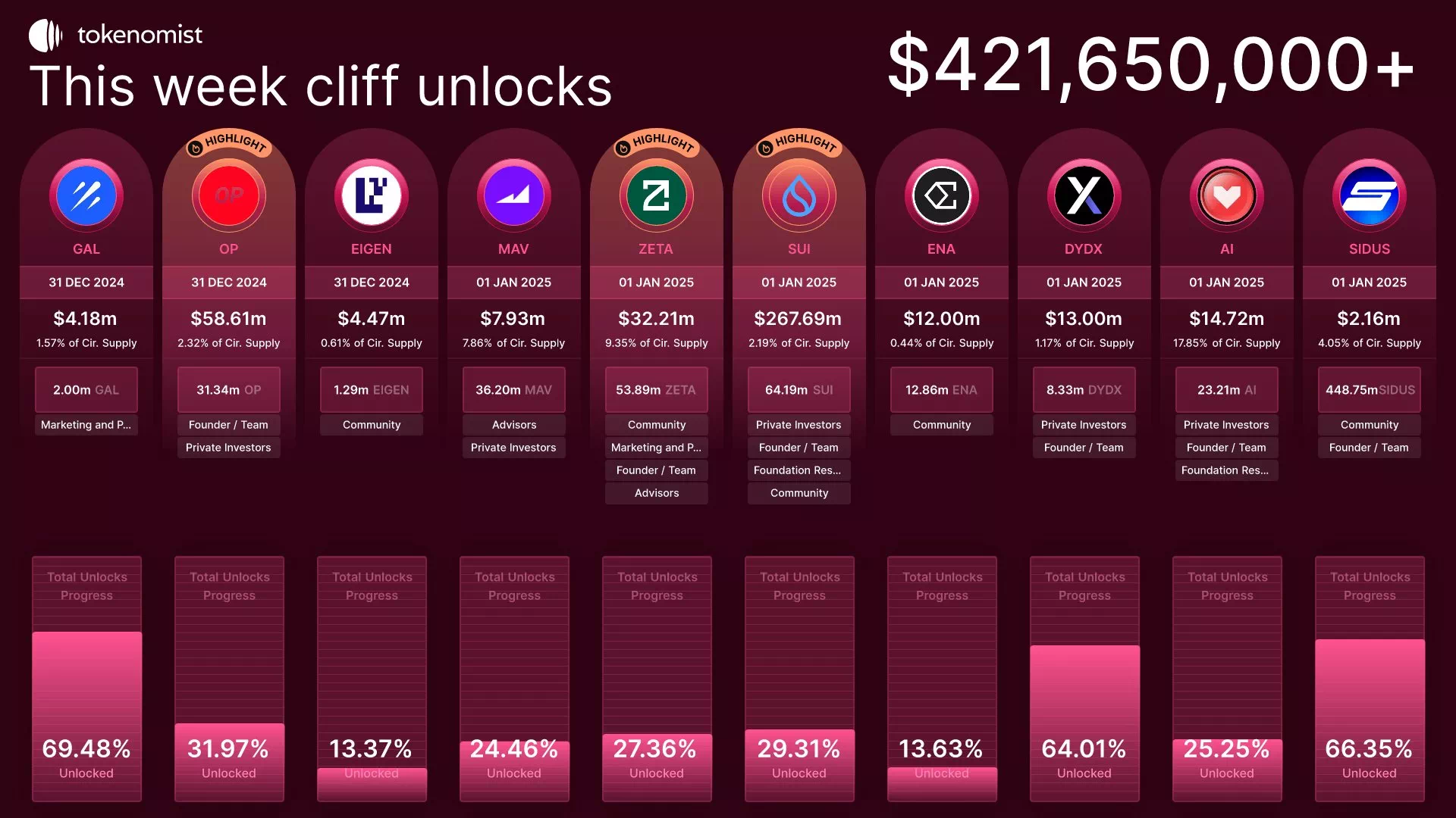 토크노미스트(구 토큰언락스) 데이터에 따르면, 현지 시간으로 12월 30일부터 1월 5일까지 주요 토큰의 락업 해제 물량은 다음과 같다: