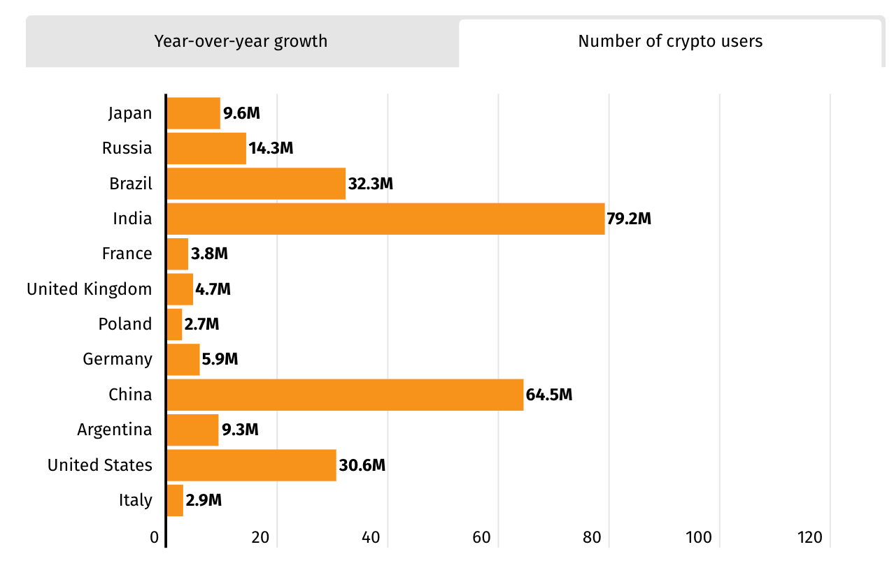 전년 동기 대비 암호화폐 채택률 증가율에서는 일본이 117%의 성장으로 가장 높았으며, 러시아(95.4%)와 브라질(77.9%)이 뒤를 이었다. 러시아는 국제 제재 회피 수단으로, 브라질은 인플레이션 회피 수단으로 암호화폐 사용이 증가했다는 분석이 나온다.