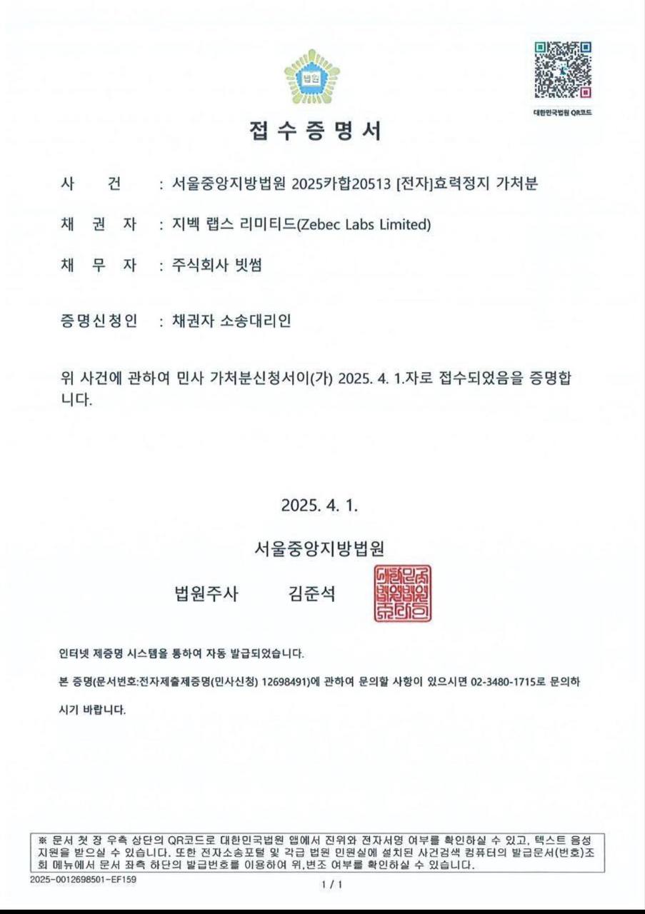 4월 1일 가상자산 프로젝트 지벡(Zebec)이 국내 가상자산 거래소 빗썸의 ZBCN 토큰 상장폐지 방침에 대응해 서울중앙지방법원에 민사 효력정지 가처분 신청을 제출했다.