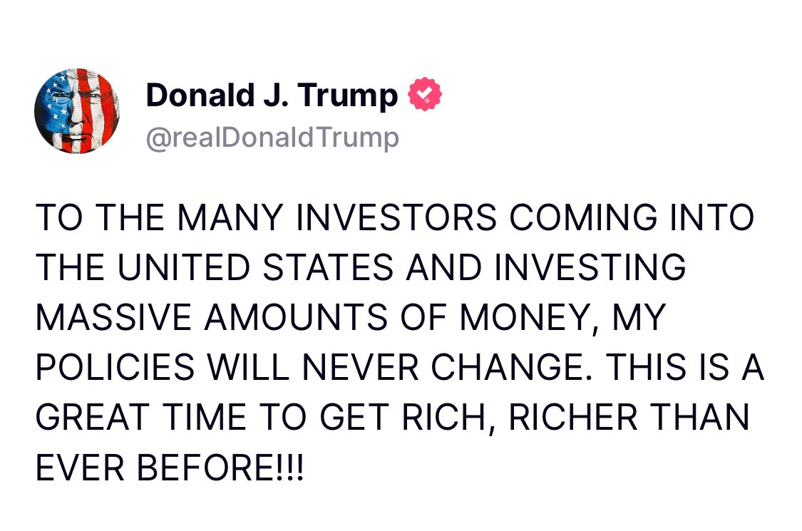 도널드 트럼프 미국 대통령은 4월 4일(현지시간) 자신의 소셜미디어 계정을 통해 “미국에 대규모 자금을 투자하는 많은 투자자들에게 말한다. 내 정책은 절대 변하지 않을 것이다. 지금은 부자가 되기에 최고의 시기이며, 그 어느 때보다 더 부유해질 수 있다”고 밝혔다.