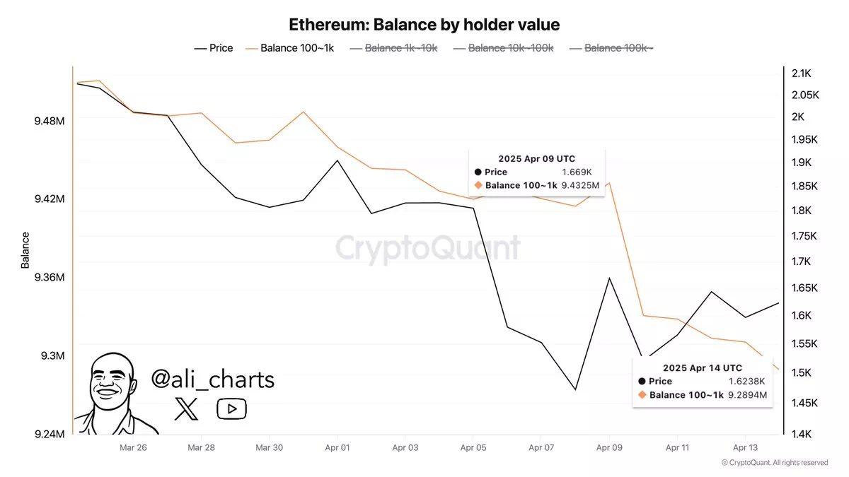 암호화폐 분석가 알리 마르티네즈는 17일, 크립토퀀트의 데이터를 인용해 100 ~ 1000 ETH를 보유한 이더리움 고래들이 지난 일주일 동안 총 14만 3,000개의 이더리움(ETH)을 시장에 매도했다고 밝혔다.