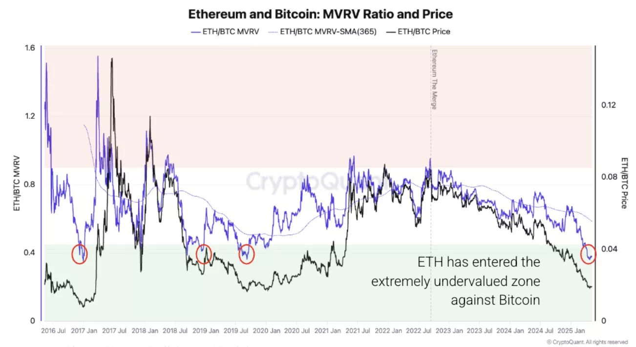 가상자산 온체인 데이터 분석업체 크립토퀀트는 이더리움이 비트코인 대비 극단적으로 저평가된 상태에 놓여 있다고 8일 주장했다. ETH/BTC MVRV 비율이 2019년 이후 최저 수준인 0.4 부근까지 하락했다는 설명이다.